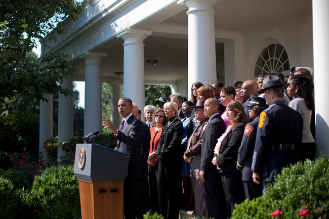 “On Thursday, I told Congress that I’ll be sending them a bill called the American Jobs Act,” Mr. Obama said during Rose Garden remarks on Monday morning, holding up the proposal. “Well, here it is.” He said that American voters could not afford to wait 14 months until the next election for lawmakers to act.