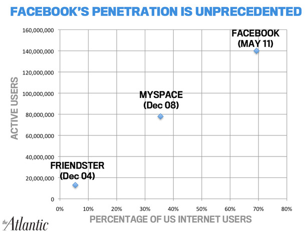 Facebook may be forever for a few reasons, only one of which is the sheer number of people — 140 million Americans — on the site. That’s a much larger percentage of Internet users than any other site has attained, as you can see in the chart above. And it’s not simply the size of Facebook that matters, but who Facebook has reached. It’s no longer the early adopters or even the second- or third-wave joiners. Facebook is now an Internet home to some very late adopters — such the people who have not and will not leave Yahoo!, AOL, and Hotmail for Google’s web services, and many of the Internet’s 65-and-older population, who now make up 6 percent of Facebookers. These people matter to the site’s staying power more than the early adopters for a simple reason: If a new site comes along, sure, I’ll check it out. But if I want to be in a social network with my mom, my aunts and uncles, some professors from college, Facebook is going to continue to be the place where I can find them.