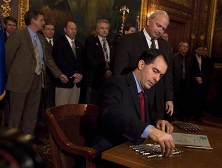 Walker’s proposals to curb the powers of public sector unions in the state as part of the budget process, ultimately approved by Wisconsin’s Republican-controlled legislature, sparked massive protests earlier this year.