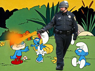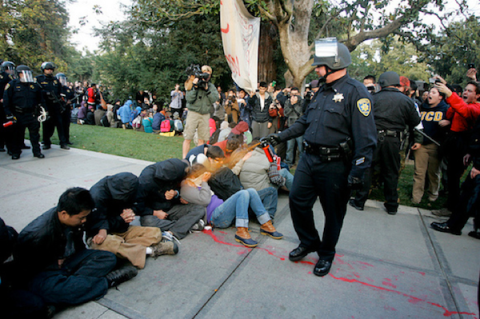 But that may well have just changed. This weekend, a series of photographs — images of a riot-gear-wearing cop shooting a group of students in the face with pepper spray — made their transition from journalistic documents to sources of outrage to, soon enough, Official Internet Meme. Perhaps the most iconic image (taken by UC Davis student Brian Nguyen, and shown at top) isn’t explicitly political; instead, it captures a moment of violence and resistance in almost allegoric dimensions: the solidarity of the students versus the singularity of the cop in question, Lt. Pike; their steely resolve versus his sauntering nonchalance; the panic of the observers, gathered chorus-like and open-mouthed at the edges of the frame. The human figures here are layered, classified, distant from each other: cops, protestors, observers, each occupying distinct spaces — physical, psychical, moral — within the image’s landscape.