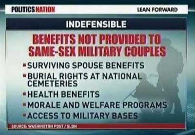 According to the Servicemembers Legal Defense Network, same-sex military couples do not have access to over 100 distinct benefits, including medical and dental insurance, increased housing allowance, relocation accommodation, and surviving spouse benefits.
