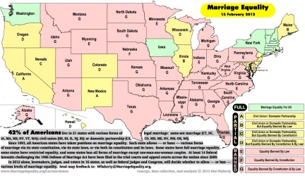 42% of Americans live in 21 states with various forms of IA, MA, NH, NY, VT, WA); civil union (DE, HI, IL, NJ, RI); or domestic partnership (CA, CT, DC, CO, MD, ME, NV, NM, OR, WI). Since 1993, all American states have taken positions on marriage equality.