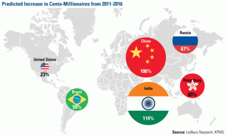 And over the next five years, wealth is set to rise rapidly across the Asian continent: KPMG estimates that centa-millionaires may increase by 114 percent in India, 76 percent in Russia and 65 percent in Hong Kong. This compares to a slower rise in wealth in the U.S., at 23 percent.