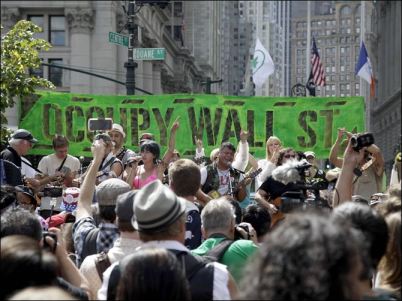On Monday, a couple hundred protesters converged near the New York Stock Exchange to celebrate Occupy’s anniversary, marking the day they first gathered at Zuccotti Park in Lower Manhattan last September. About a dozen were arrested after sitting on the sidewalk, but there was no sign of a planned “people’s wall” on the streets surrounding the stock exchange. Instead, protesters held a small meeting where they talked about the ills of Wall Street and corporate greed.